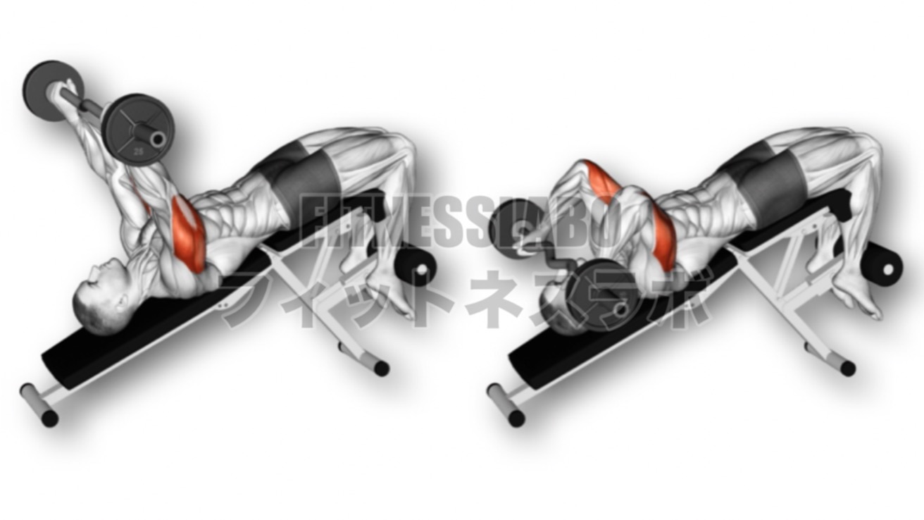 • 15〜30度のデクラインベンチに仰向けになります。